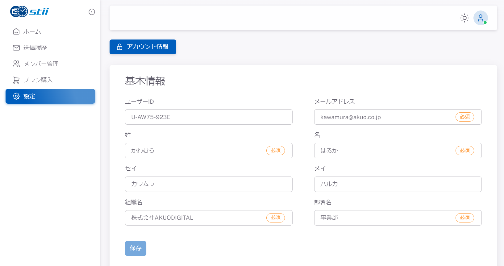姓名、セイメイ、会社名、部署名の情報が変更できます。